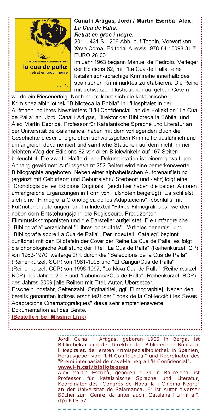 “La colección estaba formada por una magnífica selección de títulos. Hasta entonces las colecciones policíacas eran de poca calidad con textos no muy buenos y poco cuidados. ‘La Cua de Palla’ hizo que la ‘otra cultura’ se convirtiera en ‘alta cultura’”, afirma Canal.